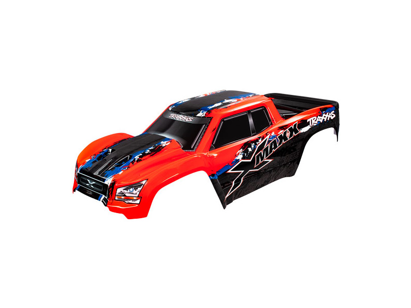 Traxxas karosérie X-Maxx červená - nabarvená s aplikovanými nálepkami, včetně rámu a ochranných prvků.