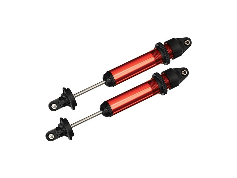 Dvojice červených hliníkových tlumičů GTX bez pružin pro RC model auta Traxxas X-Maxx. Délka roztaženého tlumiče na střed ok je 215 mm, tlumič má zdvih 56 mm. Pístnice má průměr 5 mm, lože je určeno pro pružiny o vnitřním průměru 28 mm.
