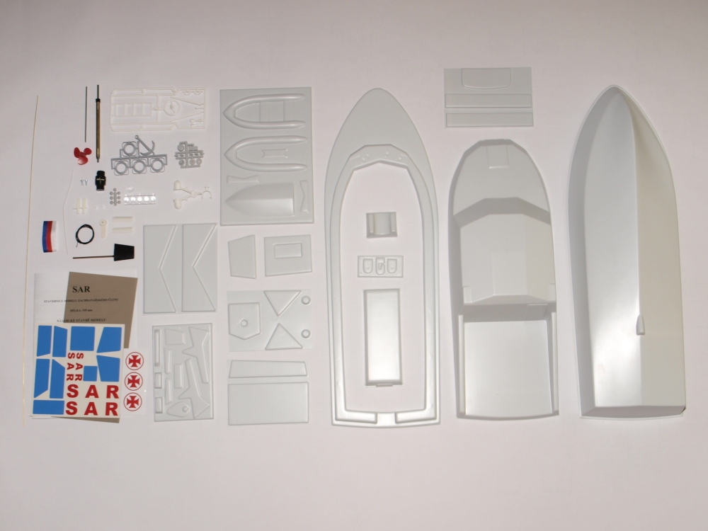 Stavebnice záchranářského člunu pro elektromotory řady 400. Model v rozsypu s trupem a nástavbami z plastu PSH, lodní hřídel, kormidlo a maketové příslušenství.