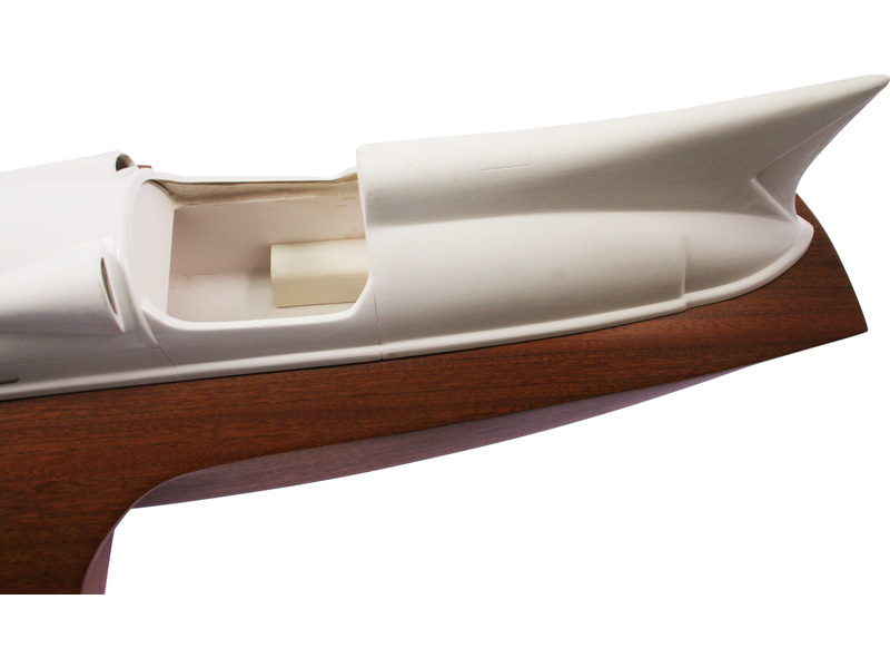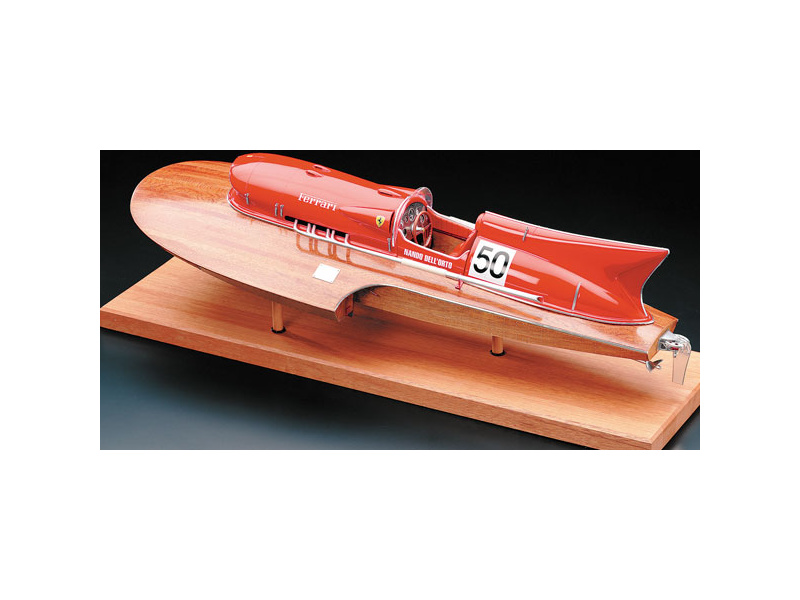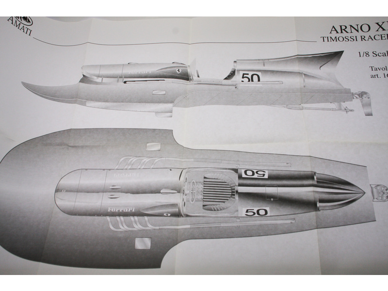 Stavebnice statické makety lodi, AMATI Arno XI Racer závodní člun z roku 1960 v měřítku 1:8, kit. Slavný závodník své doby Nando Dell'Orto se rozhodl nainstalovat 12-válcový motor Ferrari do trupu loděnice Cantieri Timossi. Konstrukce trupu je z laminátu, sedadla a panely jsou z imitace kůže, kování je z chromované mosazi.