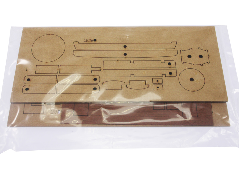 Balení obsahuje sadu překližkových dílů, sadu dřevěných lišt o různém průřezu, sáčky s drobnými díly, díly z mosazi, sadu výkresů a vícejazyčný manuál.