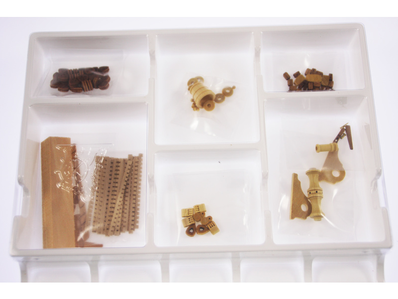 Po otevření víka krabice naleznete dřevěné díly modelu z překližky, sadu lišt, drobné součásti uzavřené v plastovém průhledném blistru, sadu výkresů a manuál.