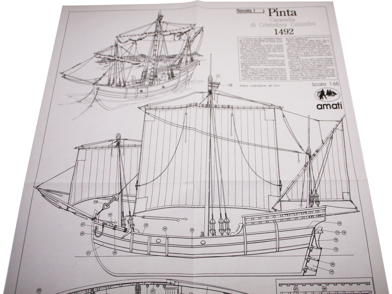 Stavebnice statické makety lodi, AMATI Pinta karavela z roku 1492 v měřítku 1:65 kit. Jedna ze tří lodí, s nimiž Columbus objevil Ameriku. Tento model je součástí série Columbus společnosti AMATI. Dřevěné díly jako kýl a obšívka jsou řezány laserem, obsahuje plachty, lanoví, stožáry, kování, plány, obrázkový a český návod ke stavbě.