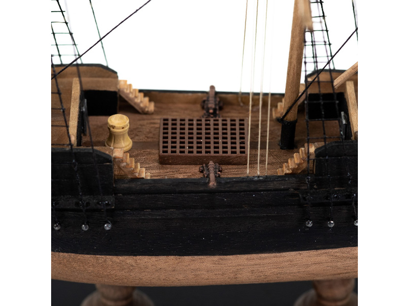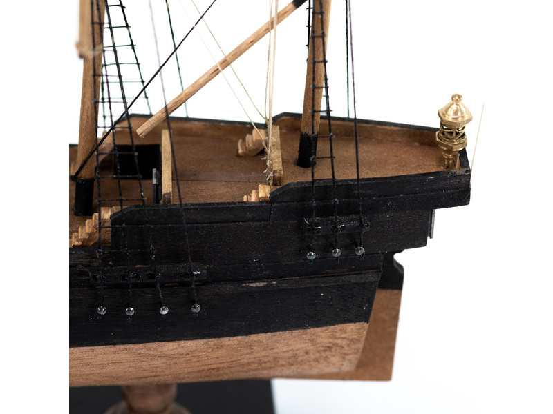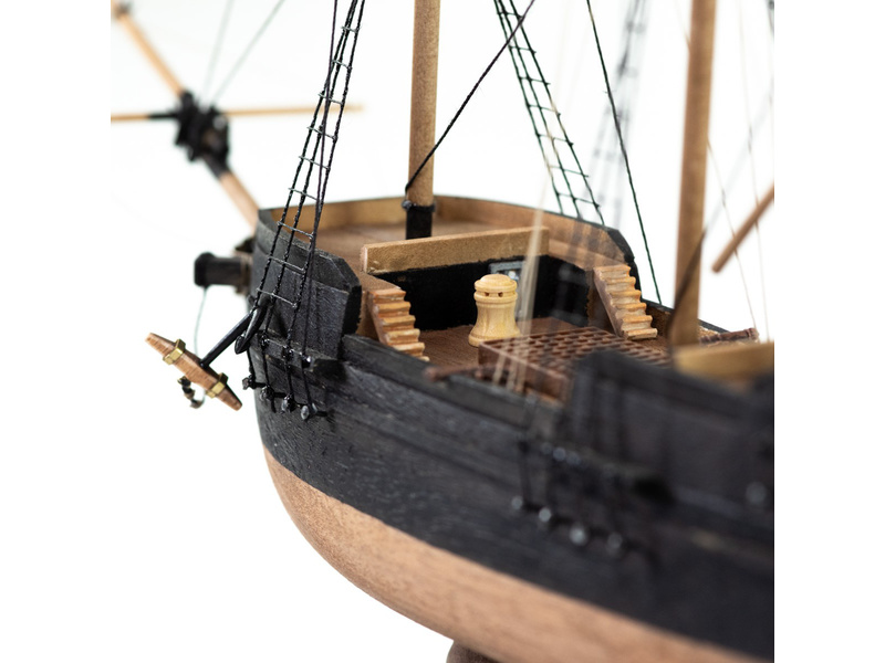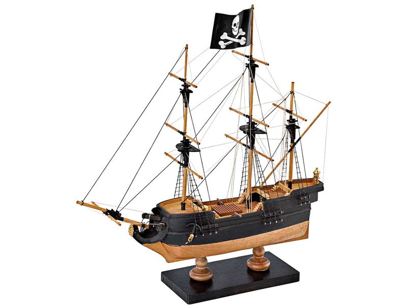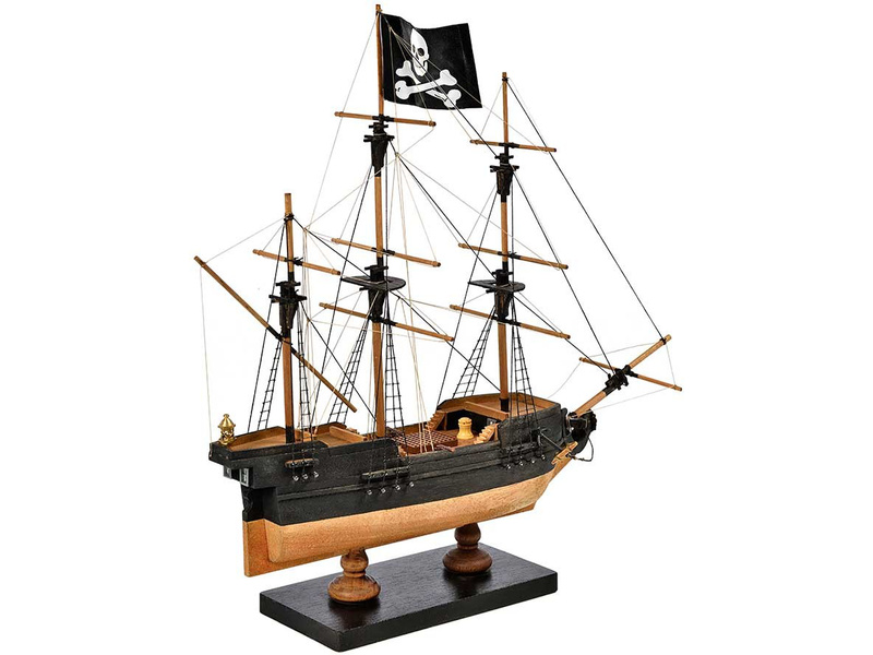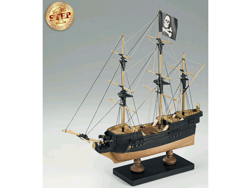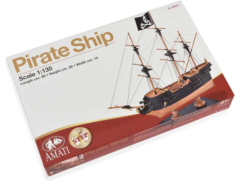 Stavebnice statické makety historické lodi, AMATI AMATI Pirátská loď 1:135 First step kit. Pirátské lodě jsou jedněmi z nejoblíbenějších lodních modelů, proto byla vytvořena série First step kit, které jsou určeny pro začátečníky. V setu je hotový dřevěný trup lodi, kýl s výřezy a drobné příslušenství. Plachty nejsou v balení.