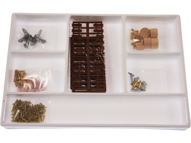 Po otevření víka krabice naleznete dřevěné díly modelu z překližky, sadu lišt, drobné součásti uzavřené v plastovém průhledném blistru, sadu výkresů a manuál.