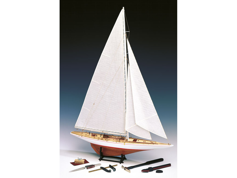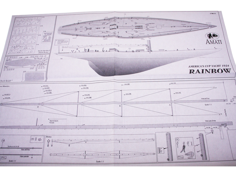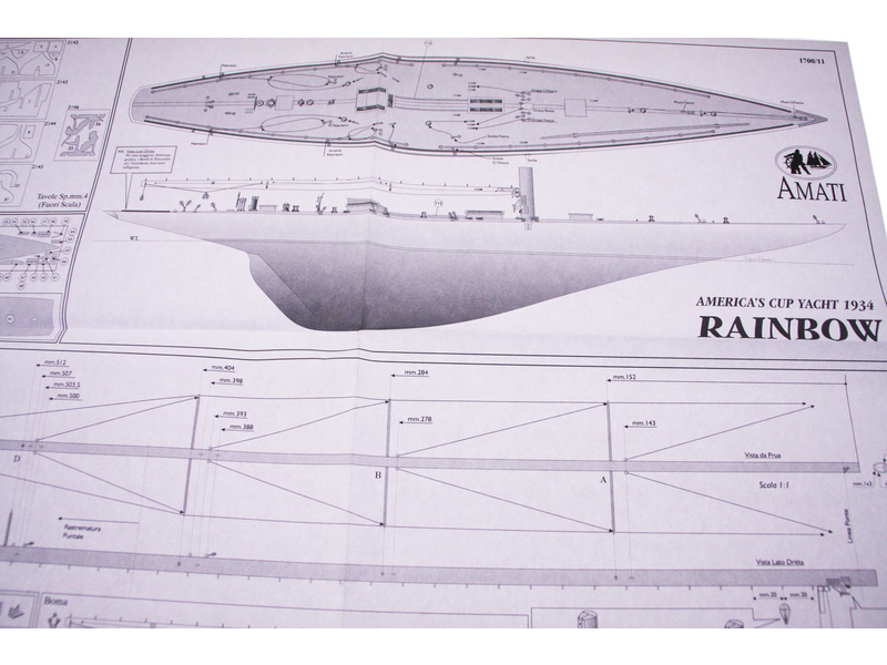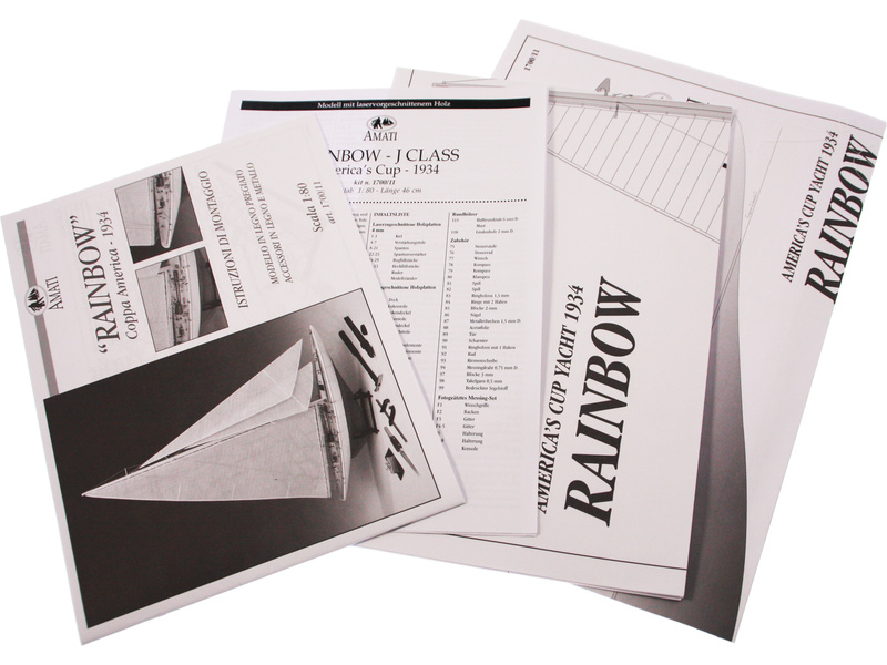 Stavebnice statické makety historické lodi AMATI Rainbow plachetnice 1934 1:80 kit. Rainbow vyrobil Starling Burgess, aby bránil americké barvy v Americkém poháru 1934. Kormidelník byl Harold S. Vanderbilt. Dřevěné díly jako kýl a obšívka jsou řezány laserem, obsaženy jsou plachty, lanoví, doplňky. V balení je i sada nářadí.
