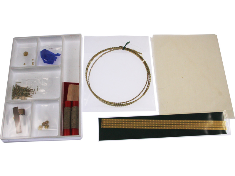 Balení obsahuje sadu překližkových dílů, sadu dřevěných lišt o různém průřezu, blistr s drobnými díly, sadu výkresů a vícejazyčný manuál.