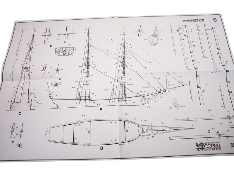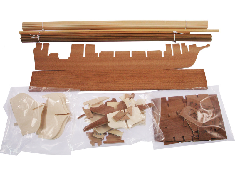 Balení obsahuje sadu překližkových dílů, sadu dřevěných lišt o různém průřezu, blistr s drobnými díly, díly z mosazi, sadu výkresů a vícejazyčný manuál.