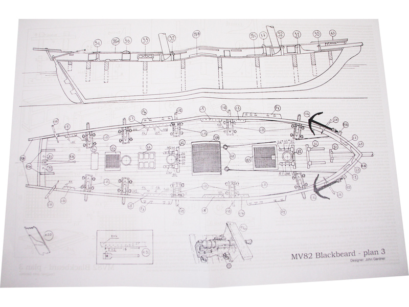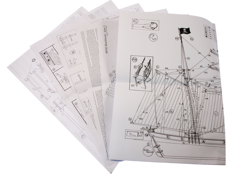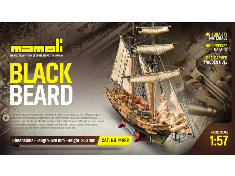 Stavebnice neplovoucího modelu MAMOLI Blackbeard v měřítku 1:57 z roku 1775. Loď známého anglického piráta a lupiče jménem Edward Teach (1680 - 22 listopadu 1718). Byl to známý "postrach moří", i když jeho dobrodružný život trval jen krátce. V balení jsou dřevěné díly, lišty a množství kování, příslušenství, plány atd.