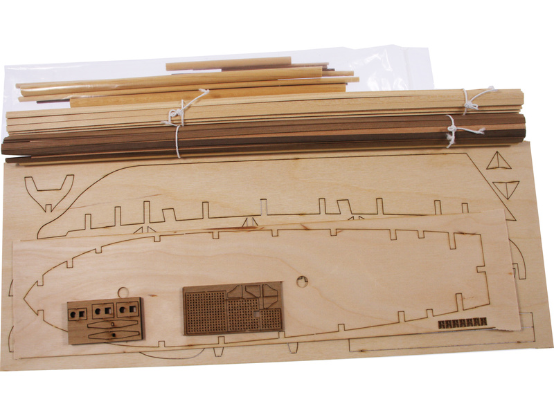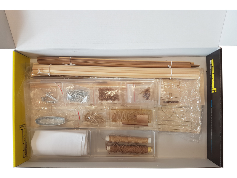 Po otevření víka krabice naleznete dřevěné díly modelu z překližky, sadu lišt, drobné součásti uzavřené v sáčcích, sadu výkresů, vícejazyčný manuál a český návod ke stavbě.