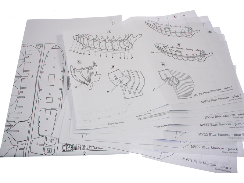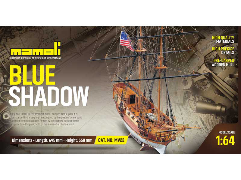 Stavebnice neplovoucího modelu MAMOLI Blue Shadow briga v měřítku 1:64 z roku 1778. Loď byla postavena pro námořnictvo Spojených států amerických s výzbrojí 12 děl. Charakteristickým je vysoký stožár a velké plachty. V balení jsou dřevěné díly, lišty a množství kování, lanoví, plány atd.