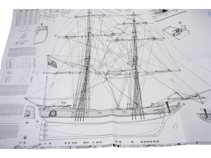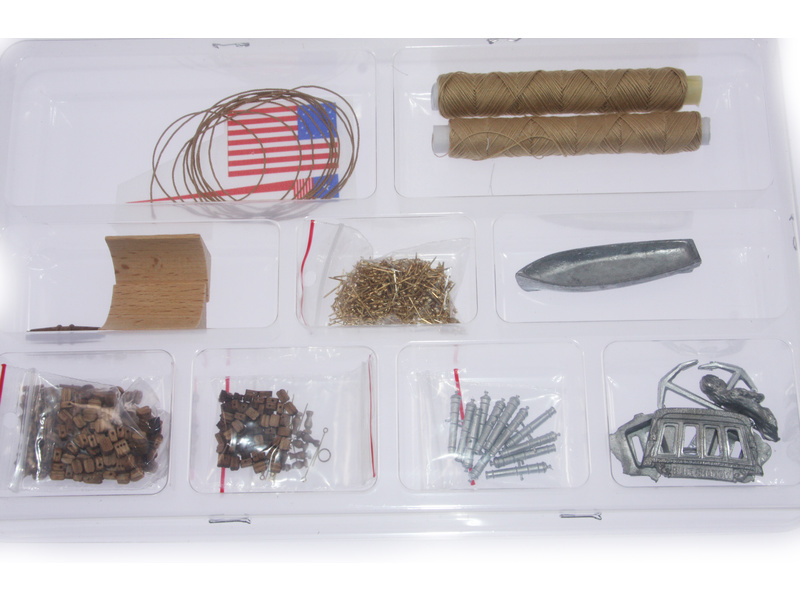 Balení obsahuje sadu překližkových dílů, sadu dřevěných lišt o různém průřezu, blistr s drobnými díly, sadu podrobných výkresů a anglický manuál.