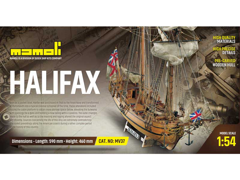 Stavebnice neplovoucího modelu MAMOLI Halifax v měřítku 1:54 z roku 1768. Původně byla postavena pro poštovní služby, Halifax poté koupilo anglické královské námořnictvo a v roce 1768 byla loď přestavěna v loděnici v Portsmouthu na typickou loď v duchu tehdejšího koloniálního stylu. V balení jsou dřevěné díly, lišty a množství kování, lanoví, plány atd.
