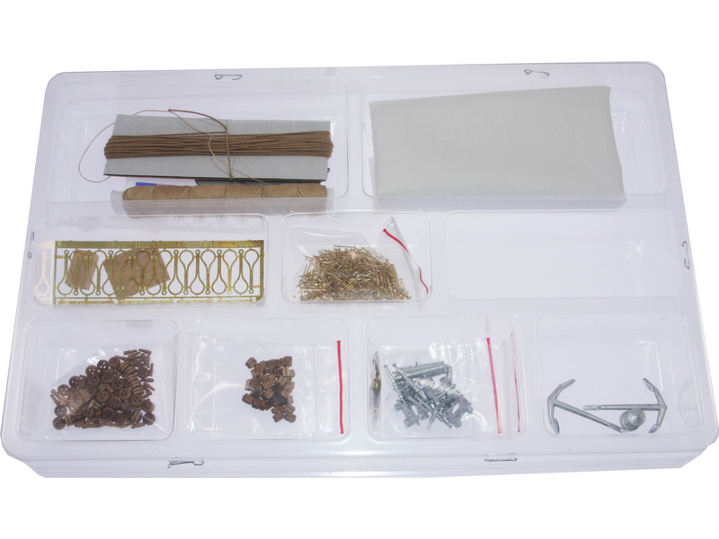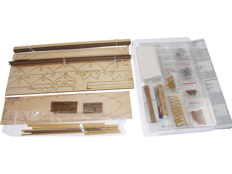 Balení obsahuje sadu překližkových dílů, sadu dřevěných lišt o různém průřezu, blistr s drobnými díly, sadu výkresů a manuál.