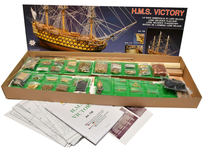 Stavebnice velké neplovoucí makety Mantua Model HMS Victory Panart v měřítku 1:78 a délce 1,3m. Skvělý model vlajkové lodi admirála Lorda Nelsona z bitvy u Trafalgaru. obsáhlá stavebnice obsahuje dřevěné díly vyřezané laserem, spoustu maketových detailů, mosazných leptů a kovových odlitků, stavební plány a návod v italštině, angličtině a němčině. Součástí je také stojánek lodi.