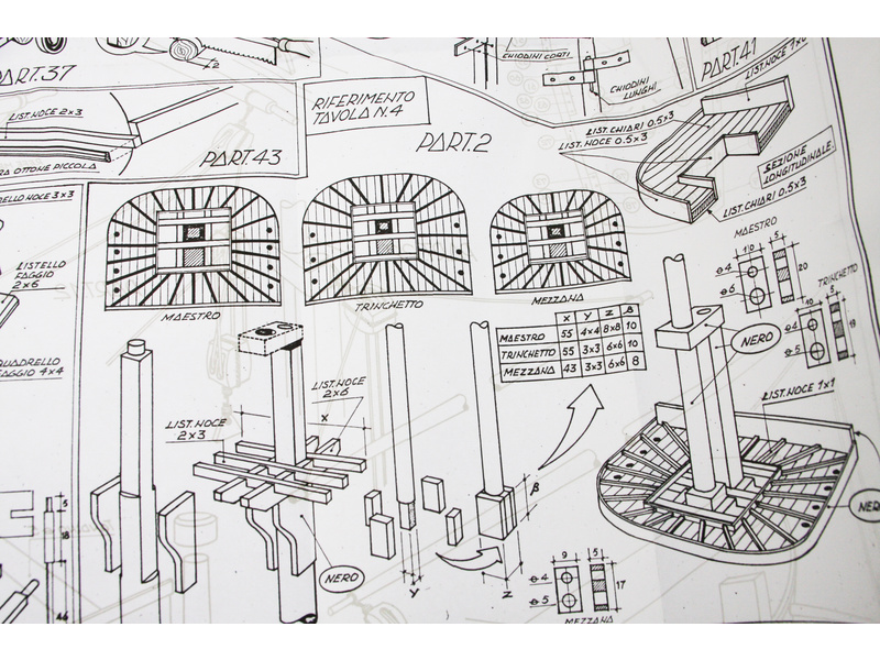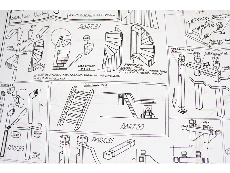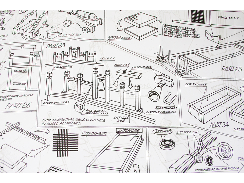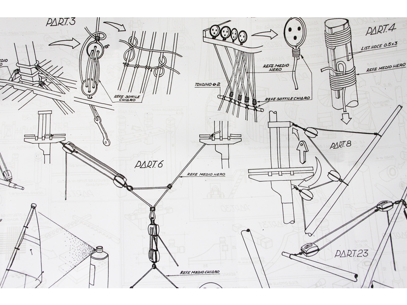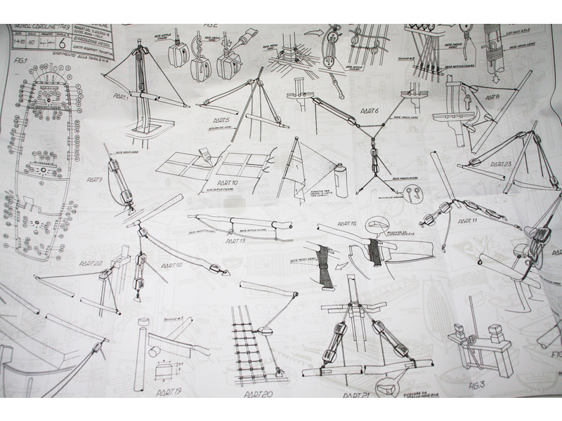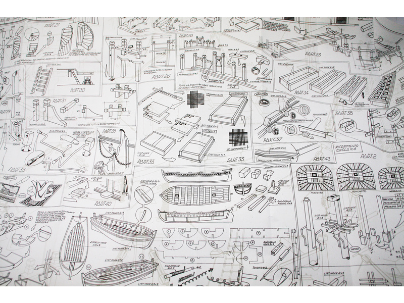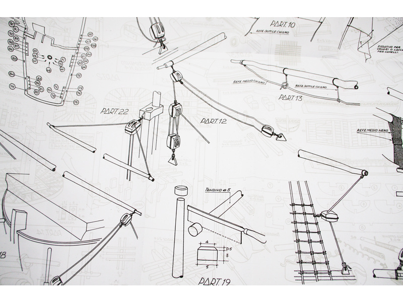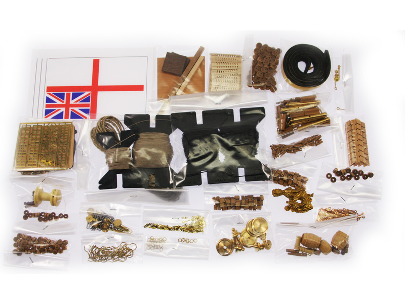 Balení obsahuje laserem řezané dřevěné díly, plaňky, paluby, stožáry, lanoví, kovové a dřevěné kování, kovové odlitky a dekorace vyleptané z mosazi. Stavební plány, vícejazyčný návod.
