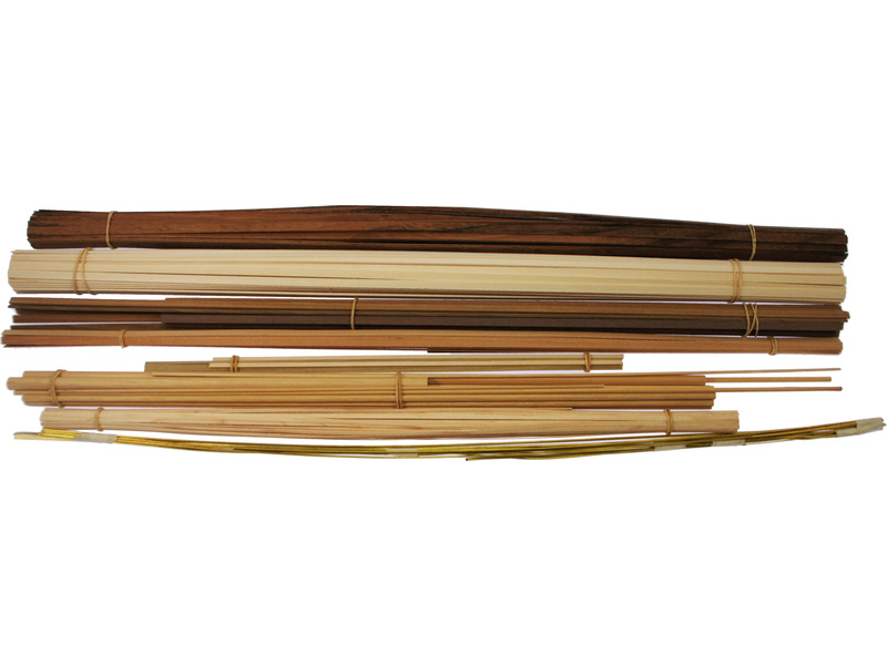 Po otevření víka krabice naleznete dřevěné díly modelu z překližky, lišty, drobné součásti v plastových sáčcích a manuál.