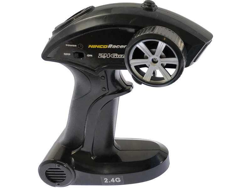 Volantový vysílač výborně padne do ruky. Pracuje na frekvenci 2,4GHz. Díky tomu nedochází k žádnému rušení. Má integrovanou anténu, která se už nikdy neulomí. Neutrální polohu kol lze jemně nastavit trimem ve spodní části auta.