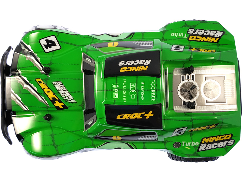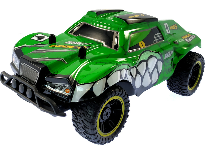 Terénní RC hračka pro děti Nincoracers Croc+ v měřítku 1:18 s délkou téměř 27 cm, patří do kategorie Short course. Díky větším rozměrů model lepé překonává nerovnosti v terénu. V předu je opatřen ochranným nárazníkem. Velká kola v kombinaci s pružinovými tlumiči skvěle kopírují terén. Karoserie je z odolného plastu. Má atraktivní zelené zbarvení s motivem čelisti se zuby. Model jede rychlostí až 15 km/h.