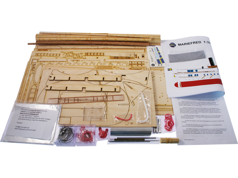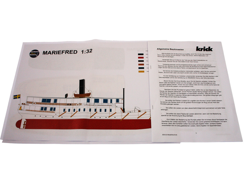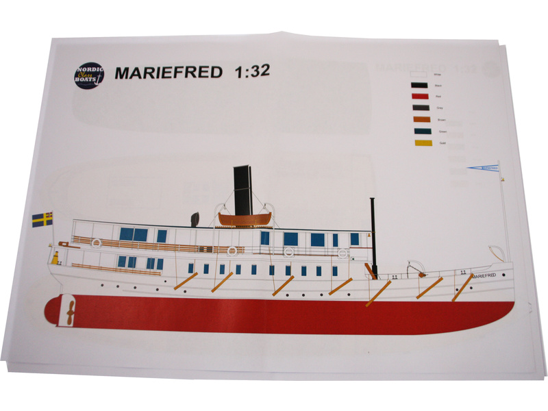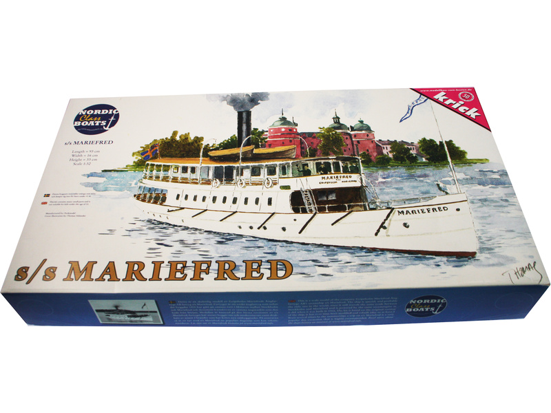 Stavebnice modelu lodi Nordic Claas Boats Mariefred s/s kit. Jeden z mála stále aktivních parních člunů ve Švédsku, Mariefred je v provozu od roku 1903 na trati Stockholm-Enhörna-Mariefred. Od té doby stále jezdí a to dokonce s původním parním strojem. Model má dřevěné díly vyřezány laserem, kování jsou kovové odlitky a mosaz.
