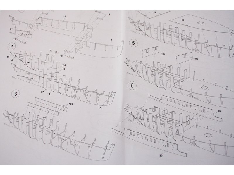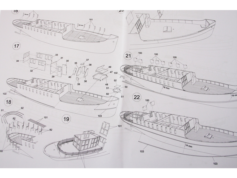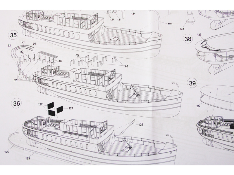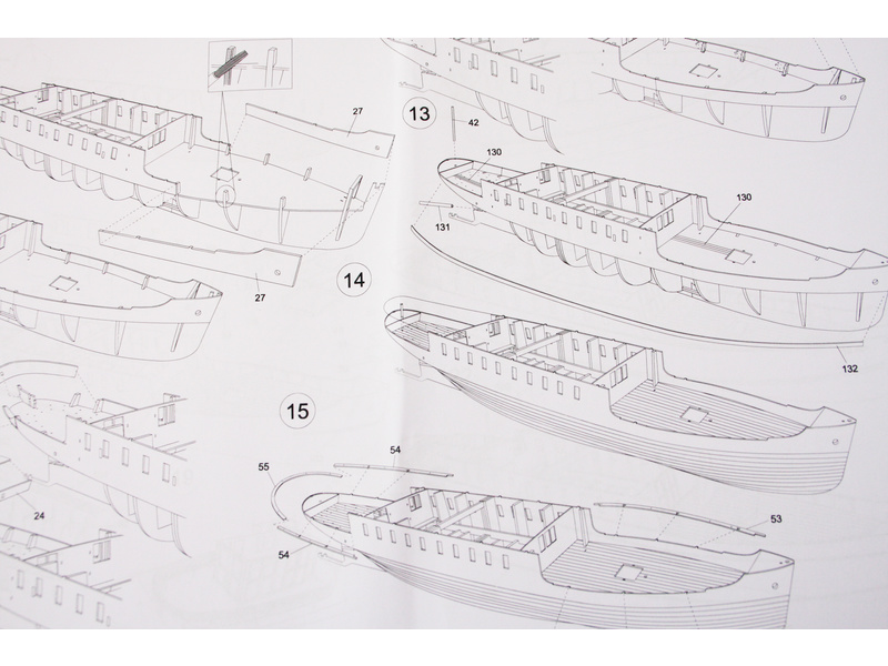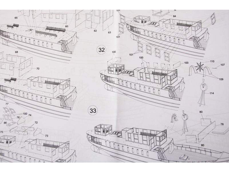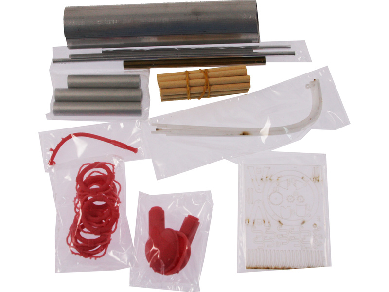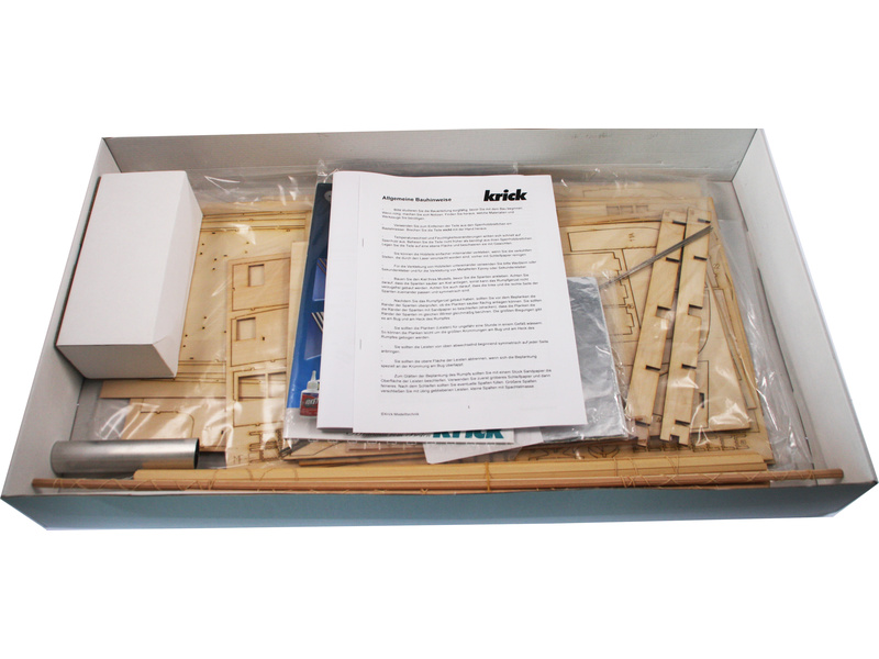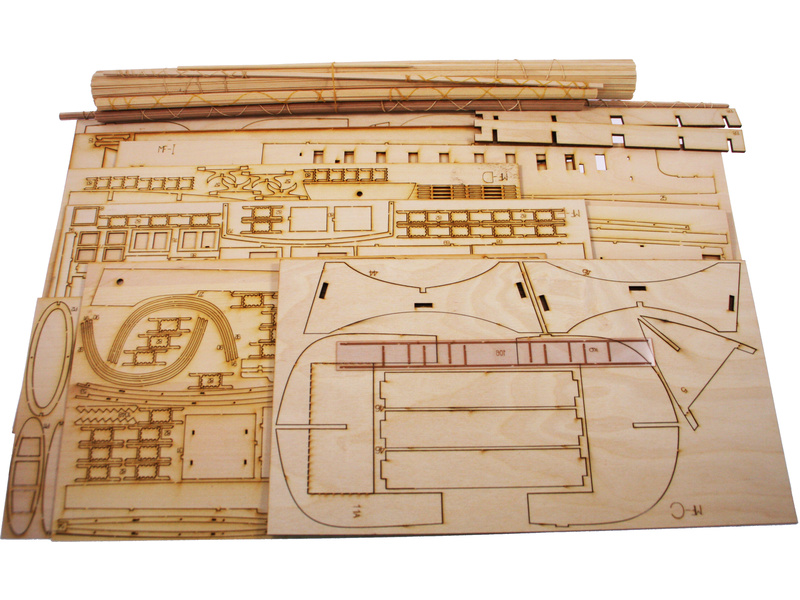 Sada obsahuje všechny dřevěné díly vyříznuté laserem a díly příslušenství a doplňků, vyrobených z litého kovu. Stavební příručka se skládá z četných ilustrací, které provázejí stavbou.