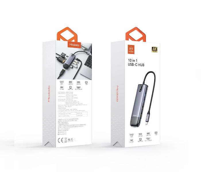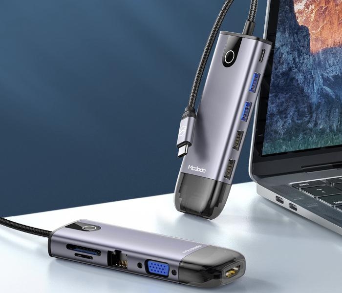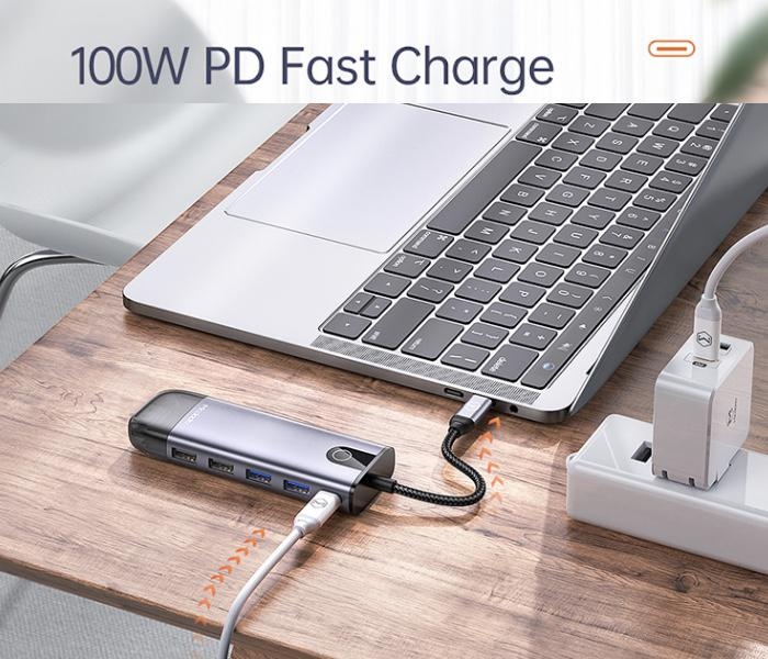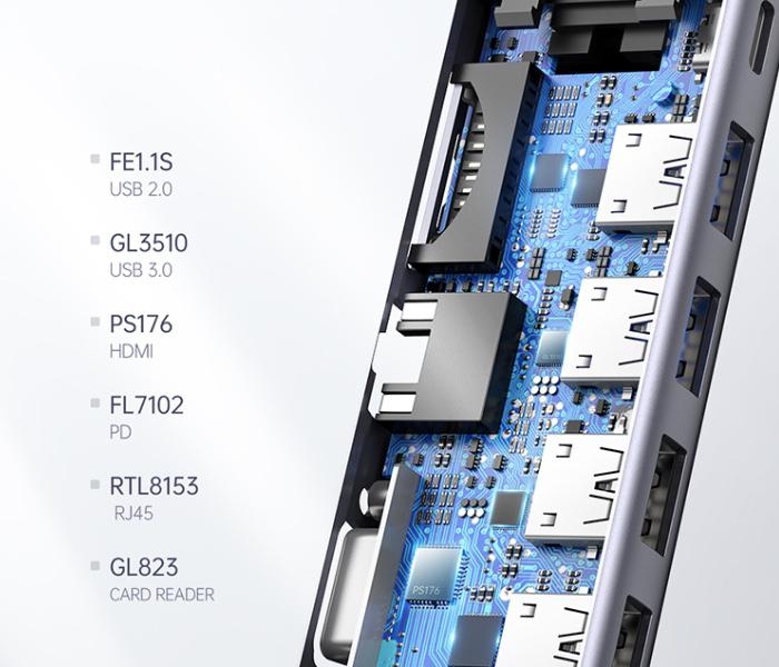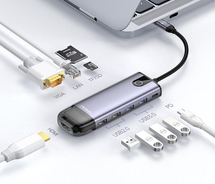 Type-C to HDMI + USB-A 2.0*2 + USB-A 3.0*2 + VGA + USB-C(PD 100W) + Gigabit LAN + SD/TF Card SlotHDMI Resolution: 4K @ 30HzUSB 3.0 Speed: 5GbpsUSB 2.0 Speed: 480MbpsUSB-C Output: 20V 5ARJ45 Port: Supports 1000M / 100M / 10M Ethernet ConnectionSD/TF Card Slot: Supports Date Read & Write