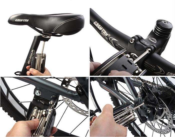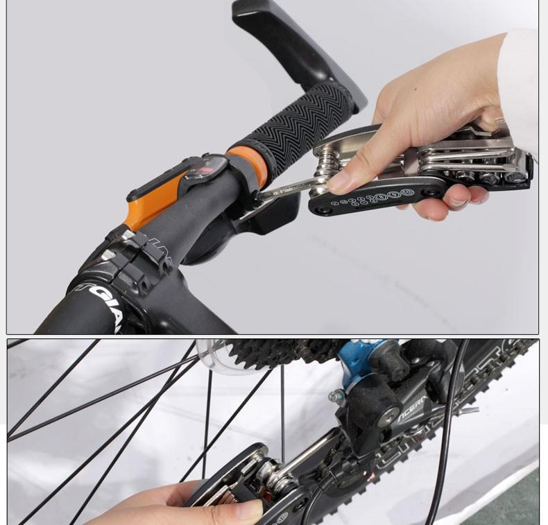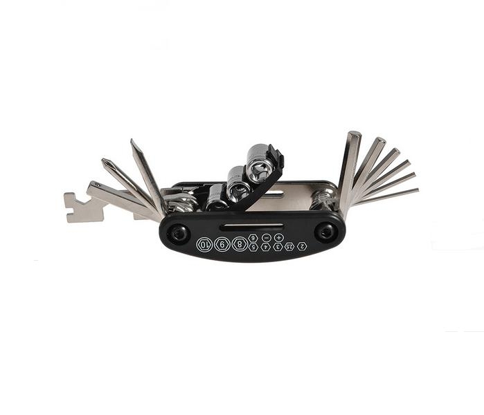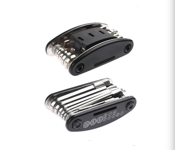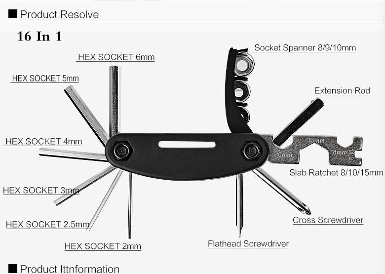 4.4cm*9cm Including Socket Wrench 8/9/10mm, Spoke Key, Slab Ratchet 8/10/15mm, Extension Rod, Cross Screwdriver, Flat Screwdriver, Allen Wrench 2/2.5/3/4/5/6mm 205g