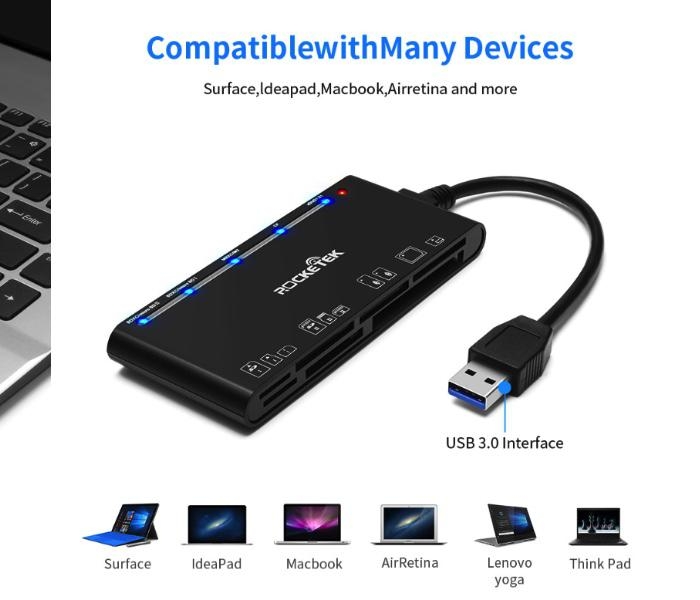USB 3.0 na CF/XD/M2/SD*2/TF*2Hmotnost: 53gVelikost: 711 * 4,8 * 1,2 cmDélka kabelu: 12 cmKompatibilní s kartami CF / XD / M2 / SD / TF 5 současně