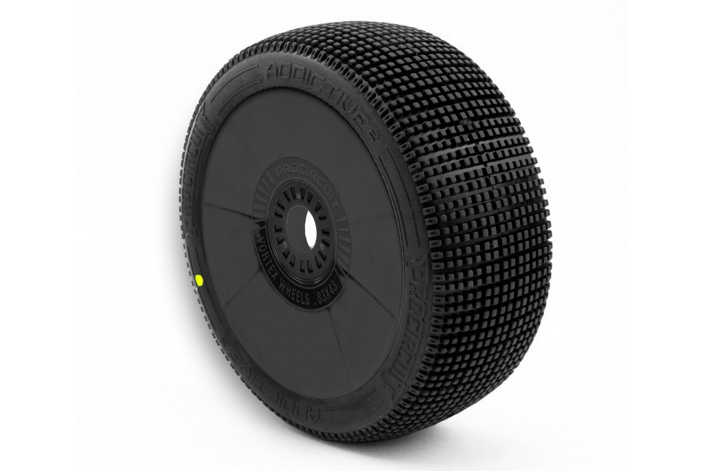 Guma ADDICTIVE V2 od PROCIRCUIT. Stejně jako jeho předchůdce byla i tato pneumatika zkonstruována tak, aby prodloužila životnost gum na nejvíce abrazivních závodních okruzích. Malé, těsně ucpané kolíky dodávají tomuto dezénu skvělé vlastnosti opotřebení na tvrdě zabalených, modře drážkovaných a leštěných površích nebo při extrémních podmínkách opotřebení s mírně prašným povrchem, který vytváří protáčení kol, což vede k vysokému opotřebení běhounu. Poskytuje nízké opotřebení, dobrou trakci vpřed a snadnou manipulaci.