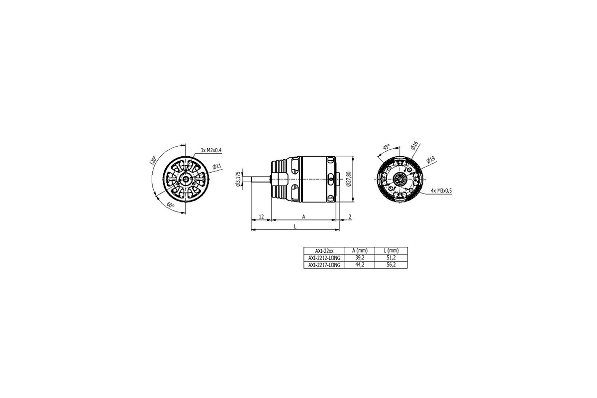 Montáž motoru: AXI 2212/26 V2 Long je primárně konstruován pro přední montáž, ale po dokoupení příslušné sady jej lze využít i v zadní montáži. Při přední montáži za čelo motoru použijte nejméně dva (protilehlé), nebo čtyři šrouby M3, které zasahují do čela motoru v rozmezí 4-5 mm. Motorová přepážka by měla být z 2-2,5 mm letecké překližky.