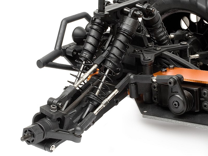 Základem podvozku je šasi vyrobené z velmi odolné slitiny 7075-T6. Výkon motoru je přenášen pomocí dvoulamelové odstředivé spojky a mszinápravových poloos k nápravám, které jsou osazeny diferenciály s kuželovým soukolím. Extra dlouhá ramena vyrobená z pevného plastu zajišřují výbornou stabilitu podvozku a pevná konstrukce zavěšení zase vynikající odolnost při havárii. O odpružení se stará 8 olejovách tlumičů s vinutými pružinami. Kompletně nastavitelná geometrie Vám dává možnost vyzkoušet si i jiné nastavení, než je to tovární. O brždění se stará brzda s jedním vrtaným ocelovým kotoučem, který zajišťuje dostatek brzdného účinku i při vysokých rychlostech.K pohonu je použit výkonný motor Nitro Star G3.0 s dvoujehlovým karburátorem a tahovým startérem. Palivová nádrž má obsah 75ccm. Rozměrný RC box je nejen uzavřen proti nečistotám, ale je umístěn daleko od palivové nádrže, čímž je chráněn před nechtěně rozlitým palivem. Kola s 14mm unašečem jsou obuta do pneumatik s "traktorovým" vzorkem. K ovládání je použita volantová RC souprava TF-1 ve spojení s přijímačem RF-1 a servy SF-1