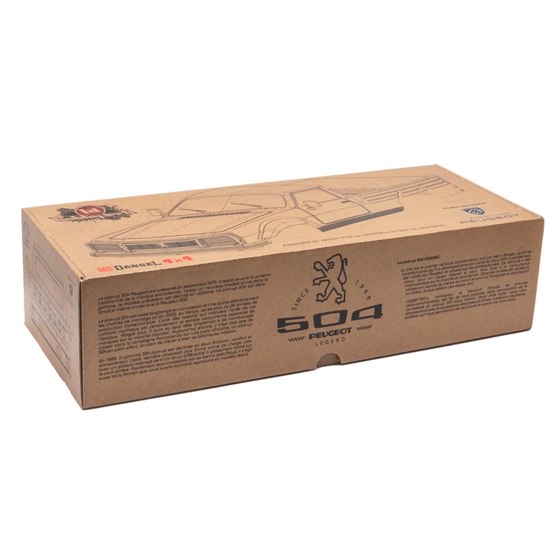 HOBBYTECH, francouzský designér a výrobce rádiem řízených podvozků/modelů, vám s hrdostí nabízí tuto reprodukci karoserie pick-upu 504 v licenci. V této krabici nabízíme několik doplňků (lemy blatníků, ochrana světlometů, polepy), které vám umožní reprodukovat verzi dle vašeho výběru.