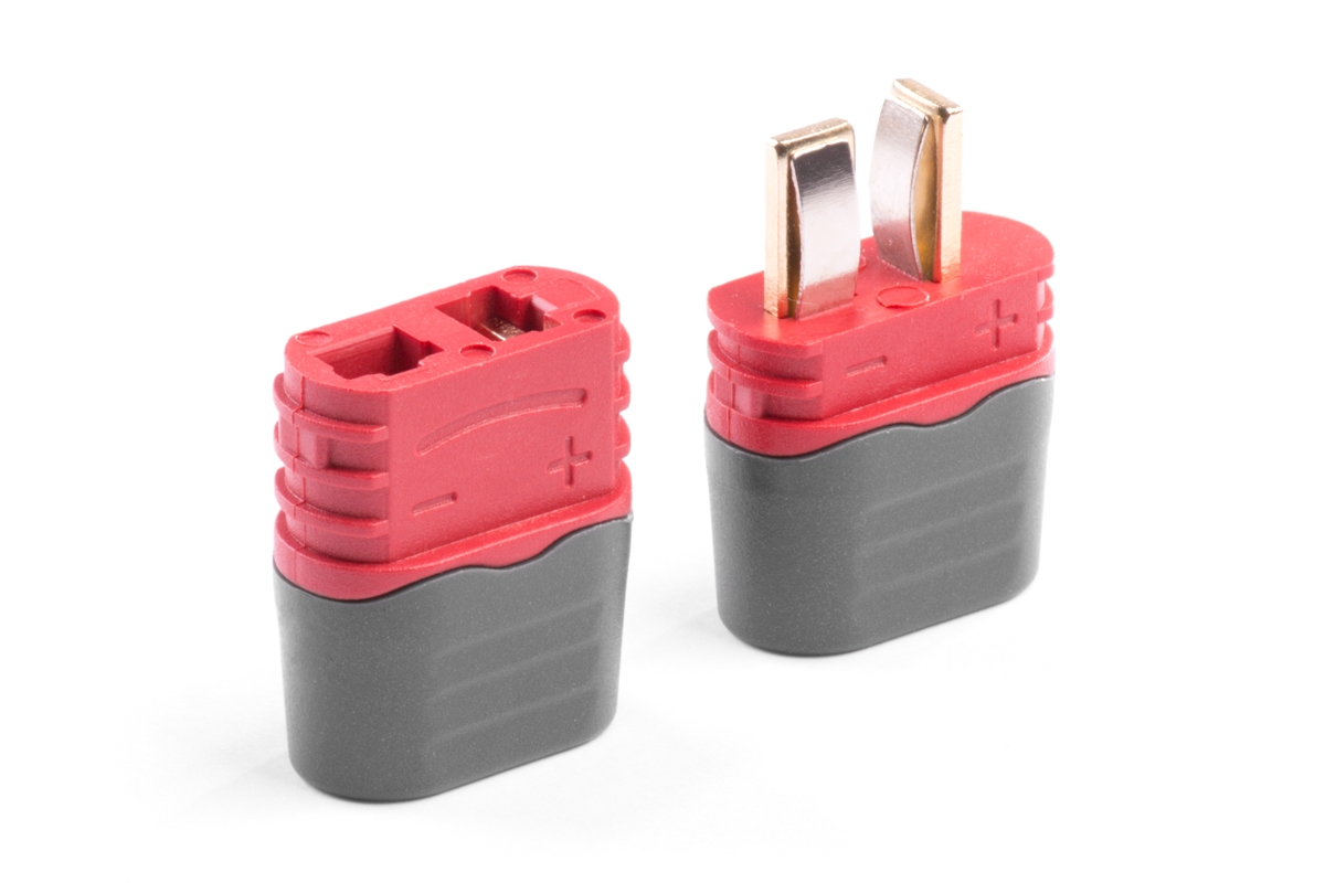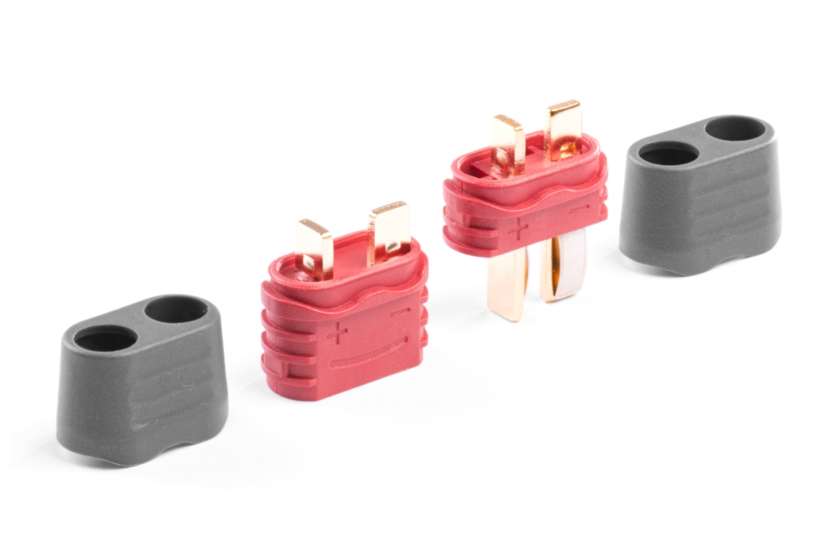 Dvoukolíkový silový konektor s plochými zlacenými kontakty se zatížitelností max. 50 A (dlohodobě 25A) se zaobleným drážkovaným tělem pro pevnější uchopení a kryty kabelů. Pro kabely o průřezu max. 3,3 mm2 (12AWG). Přechodový odpor 0,45 mOhm, max. 500 V. Balení 10 párů s kryty kabelů.