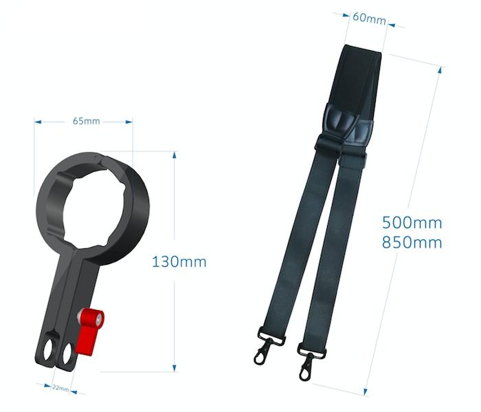 Popruh pro Ronin-S zmenšuje zátěž na ruce při dlouhodobé práci s přístrojem. + 2x 1/4 porty, 1x 3/8 porty a 4x Otvory na krk pro Ronin serie Hmotnost: 24g