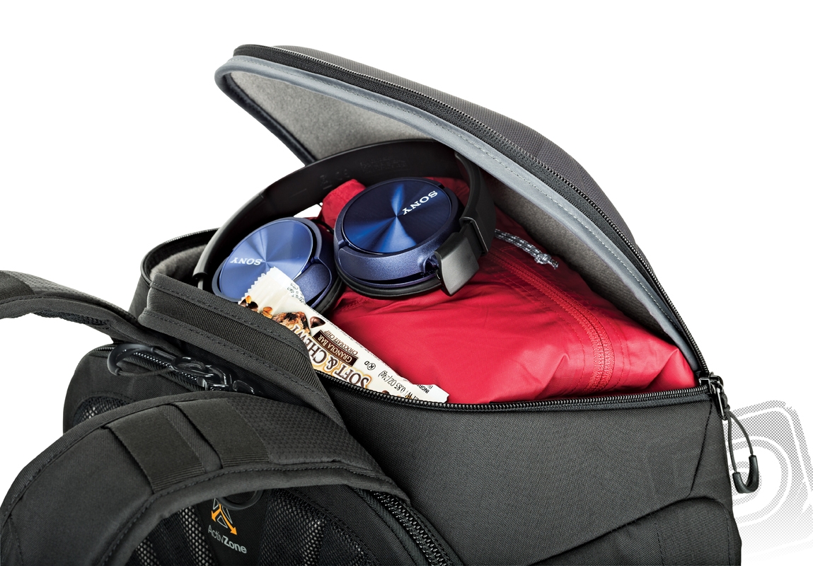 - Odnímatelný panel s kompresními oky pro uchycení příslušenství a kapsou na smartphone