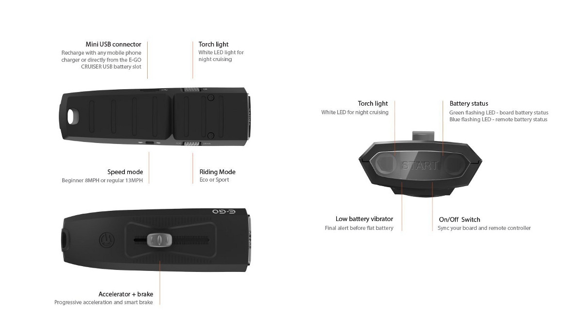 Součástí balení je Longboard EGO1 kompletně připravený k jízdě, bezdrátové dálkové ovládání, USB nabíječ ovladače, drobné příslušenství a nabíječ.