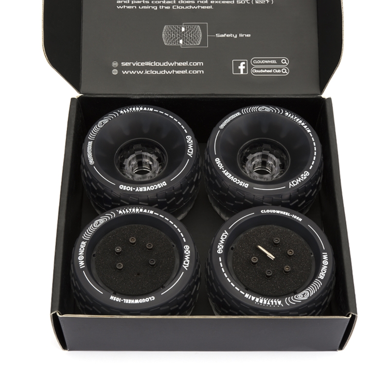 Speciální terénní kola Cloud Wheel s jádrem z tvarované tlumící pěny. Oblý tvar a speciální vzorek zajišťují větší přilnavost v zatáčkách. Combo je kompatibilní s Hubovými verzemi longboardů Exway. Balení obsahuje vše nutné pro montáž.