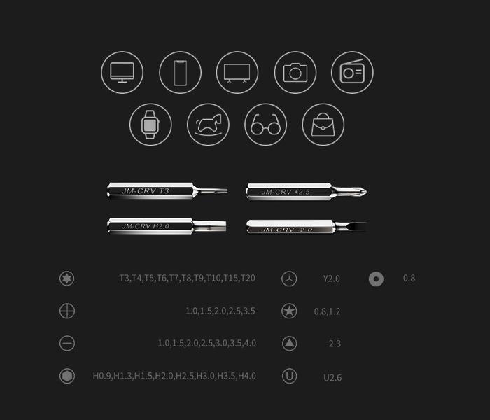 Ruční stopka je vyrobena hlavně ze slitiny hliníku, trvanlivá a lehká. Automaticky převrátit design, pohodlně vymýtit příslušenství a přenosný. Vhodné pro notebooky, chytré telefony a tablety. Různé druhy šroubováků, spokojené s různými požadavky. Bity jsou vyrobeny z 6150 CR-V po kalení a jasném chromování, trvanlivé a spolehlivé 6. Balení obsahuje: - 36 x CR-V Bits Screwdriver Set (Torx: T3, T4, T5, T6, T7, T8, T9, T10, T15, T20 Ostatní: H0.9, H1.3, H1.5, H2.0, H2.5, H3.0, H3.5, H4.0 Přímý: 1,0, 1,5, 2,0, 2,5, 3,0, 3,5, 4,0 Philips: 1,0, 1,5, 2,0, 2,5, 3,5 Trojúhelník: 2,3 Y tvar: Y2,0 Pětihvězdičková: 0,8, 1,2 U Tvarovaná: U2,6 Bod: 0,8) - 1 x rukojeť z hliníkové slitiny - 1 x prodlužovací tyč