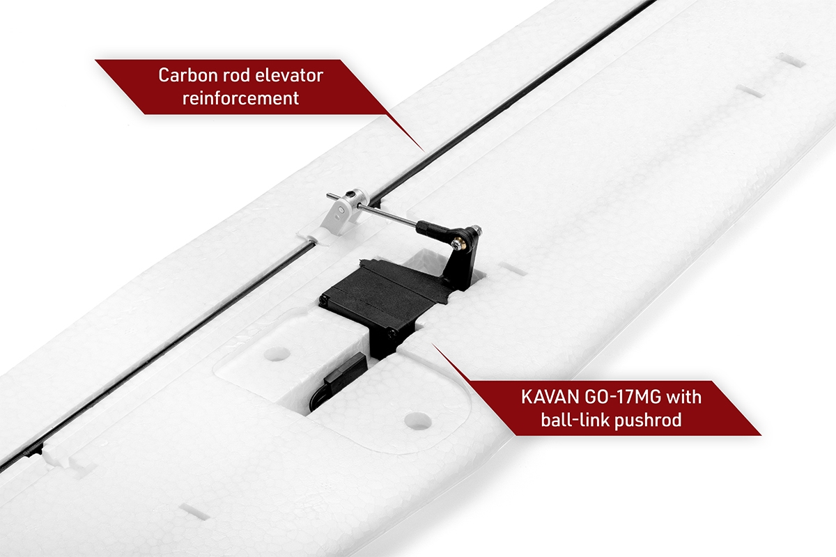 Trup modelu je zhotoven z vysoce odolného pěnového EPO (extrudovaného polyolefinu) s důkladnými vnitřními uhlíkovými výztuhami. V přídi je nainstalován střídavý elektromotor C3548-750 se sklopnou vrtulí 11x8“ a regulátorem KAVAN R-50SB s výkonným BEC stabilizátorem napájení potřebným pro napájení 4 silných mikroserv na palubě. Kryt kabiny je odnímatelný, upevňuje se pomocí čepu vpředu a magnetu vzadu. V přídi najdete dostatek prostoru pro pohonný akumulátor a přijímač. Serva směrovky a výškovky jsou uložena v kýlovce, kormidla ovládají krátkými přímými drátovými táhly.