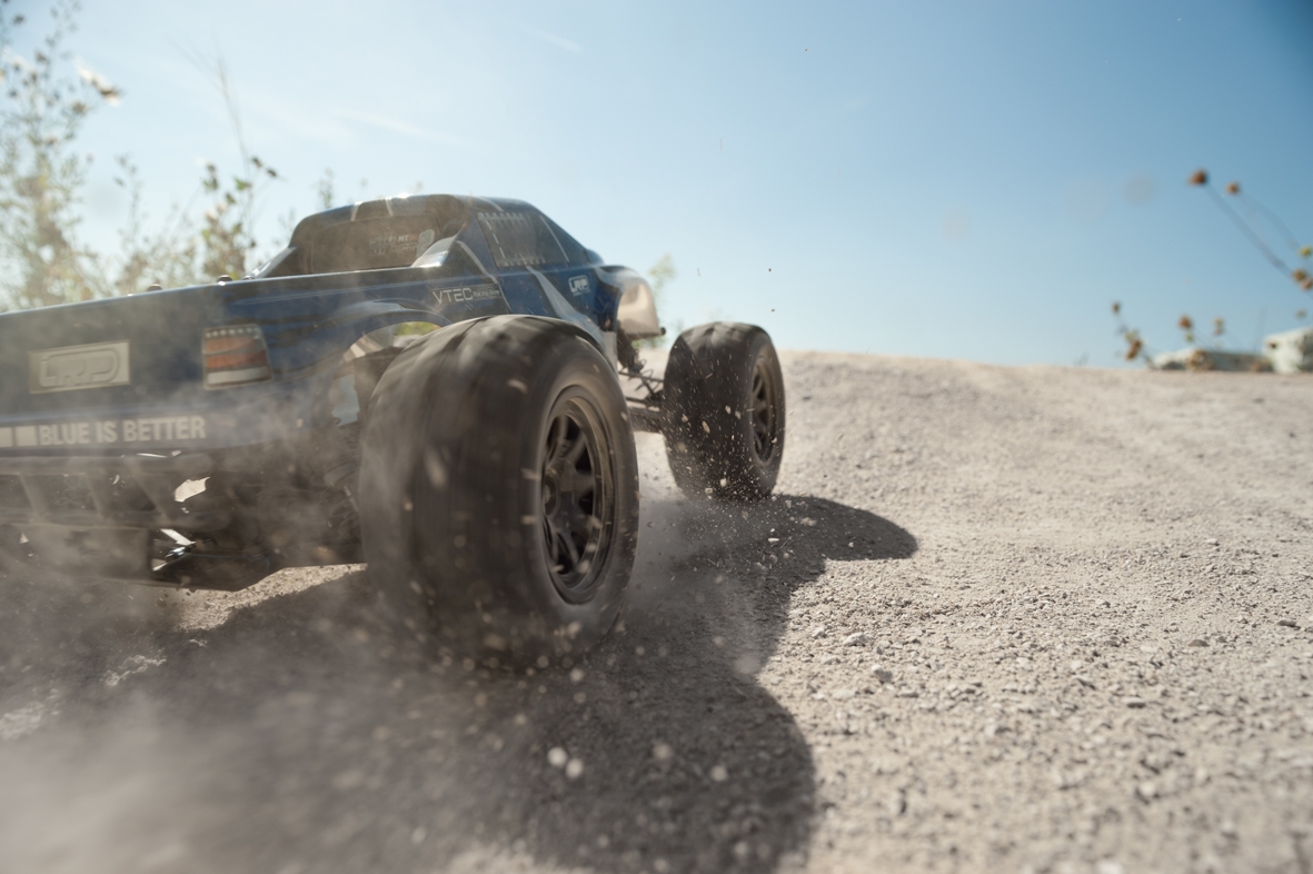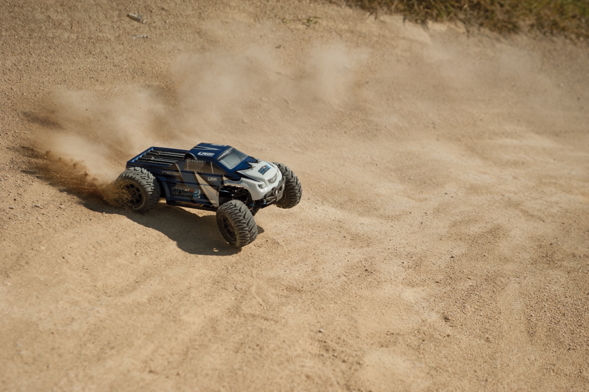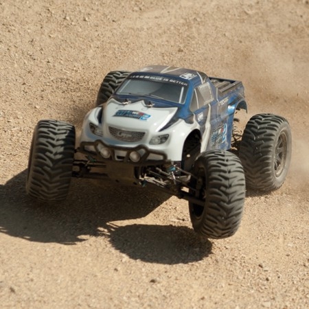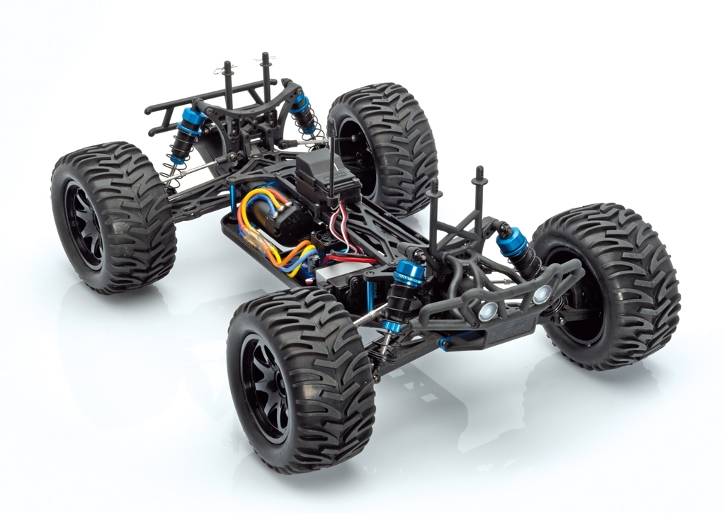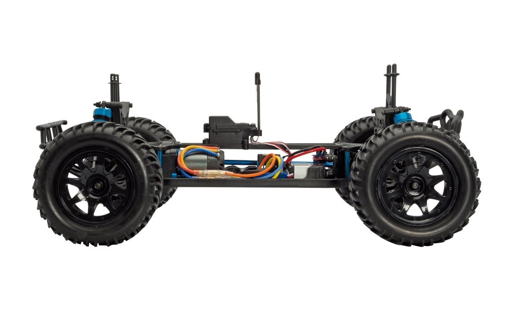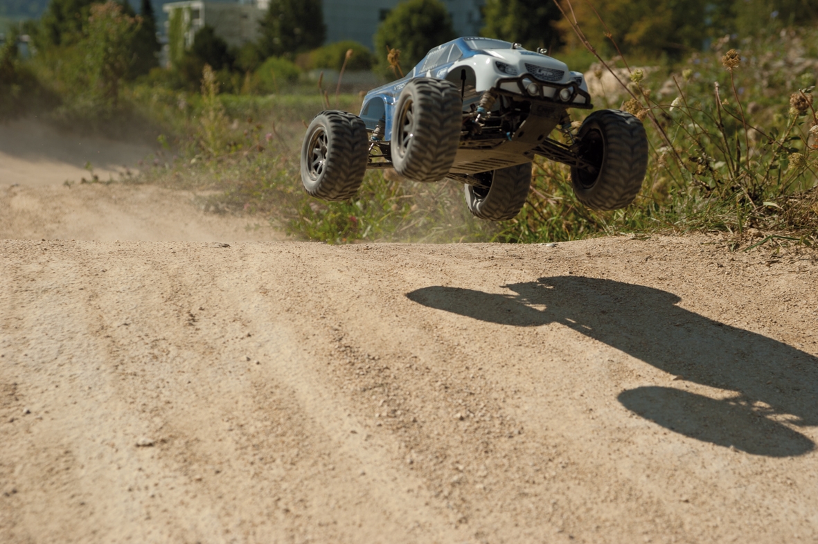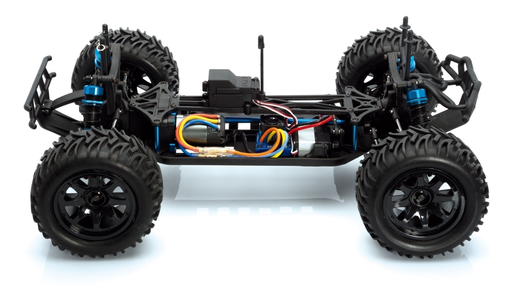 Model monster truck v měřítku 1:10 s pohonem všech kol 4x4, poháněný střídavým motorem vč. RC volantové soupravy 2,4 GHz. Vodotěsné servo a vodotěsná schránka přijímače.
