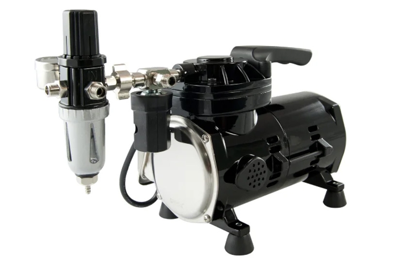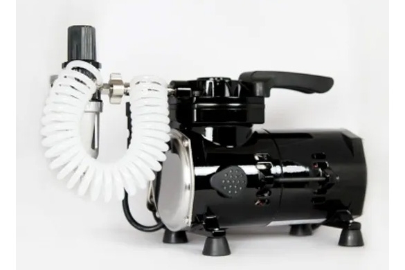 Kompresor pro začátečníky i profesionály je vybavený automatikou, redukčním ventilem tlaku, odkalovačem a oplétanou hadicí. Velmi nízká hlučnost, hmotnost jen 3,2 kg. Zapínací/vypínací tlak 40 psi/60 psi. Průtok vzduchu 14-18 l/min.