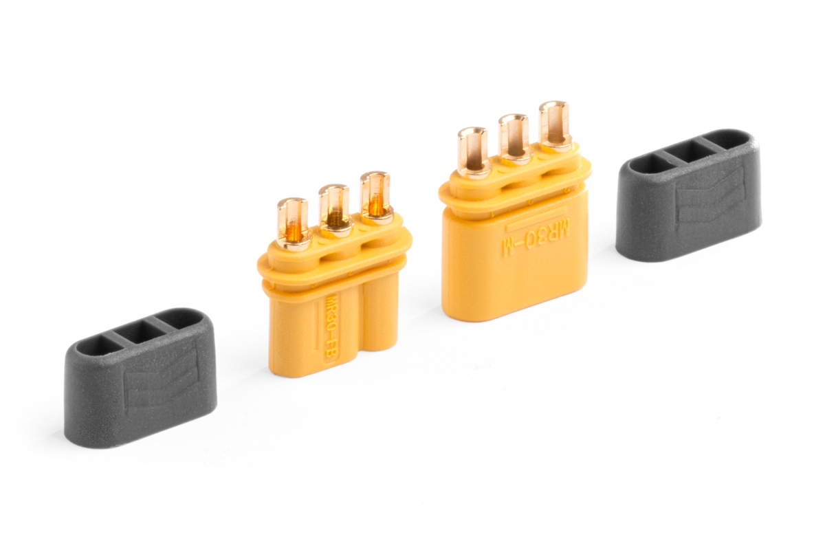 Tříkolíkolíkový silový konektor se zlacenými kontakty se zatížitelností max. 30 A a kryty kabelů. Pro kabely o průřezu max. 1,3 mm2 (16AWG). Přechodový odpor 0,70 mOhm, max. 500 V. Ideální pro propojování střídavých elektromotorů a regulátorů. Balení 1 pár.