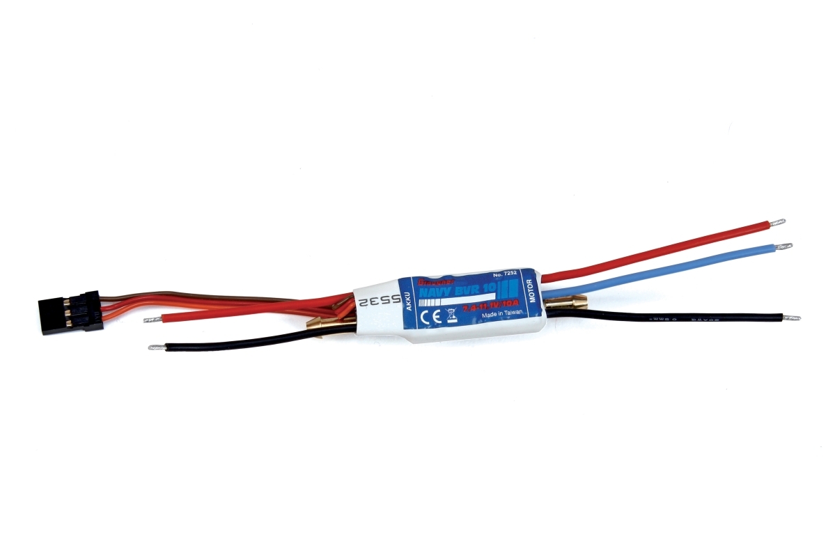 Jednosměrný programovatelný střídavý regulátor pro modely lodí s vodním chlazením. Trvalý proud 10A (krátkodobě při teplotě 25°C 15A), napájení 7.4-11,1V/2-3 LiPO článků, BEC 6,0V/1A, hmotnost 14.4 g, rozměry 40x15x15mm.