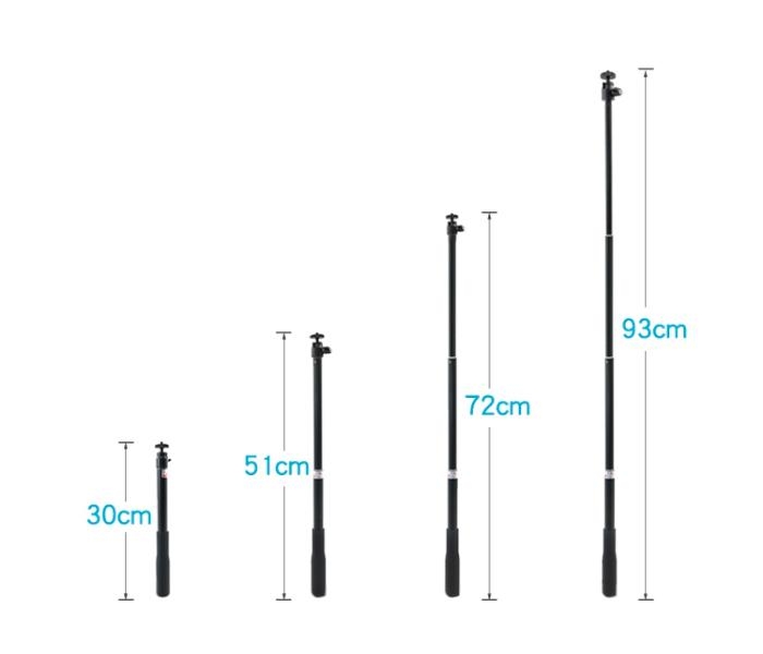 Teleskopická extra dlouhá selfie tyč 30-93cm ze slitiny hliníku. Vylepšený grip díky pogumovanému úchopu. 1/4 palcový závit pro další příslušenství. Hmotnost: 180g