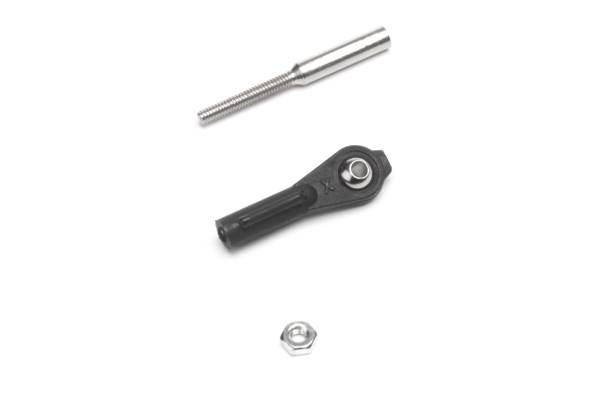 Nylonový pouzdro s kulovým čepem s otvorem 2mm pro pohyb bez tření. M3 závit v nylonovém pouzdře. Včetně ocelové spojky táhla se závitem M3 (KAV0130A) a M3 matky.. Balení 10setů.