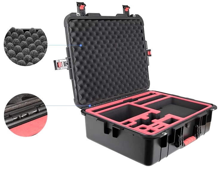 634mm*503mm*227mm 7kg Voděodolné pevné pouzdro s krytím IP67 je vyrobeno z polypropylenu a je dodáváno s pěnovou vložkou na míru s přihrádkami a přepážkami, které udrží vaše vybavení v bezpečí a na svém místě. Kromě přihrádky Ronin-S/SC jsou zde přihrádky pro fotoaparát, stativ, nabíječku, montážní desku fotoaparátu, podložku pro zvýšení fotoaparátu, monopod, tašku s příslušenstvím a různé drobné vybavení.
