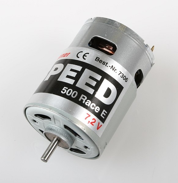 Stejnosměrný motor velikosti 500 uložený v kluzných ložiskách. Provozní napětí: 3,6 - 8,4V, 22.500 o/min. při 7,2V, hřídel 3,17mm, délka motoru 55mm, průměr motoru 36mm, délka hřídele 12,2mm, váha 189g.