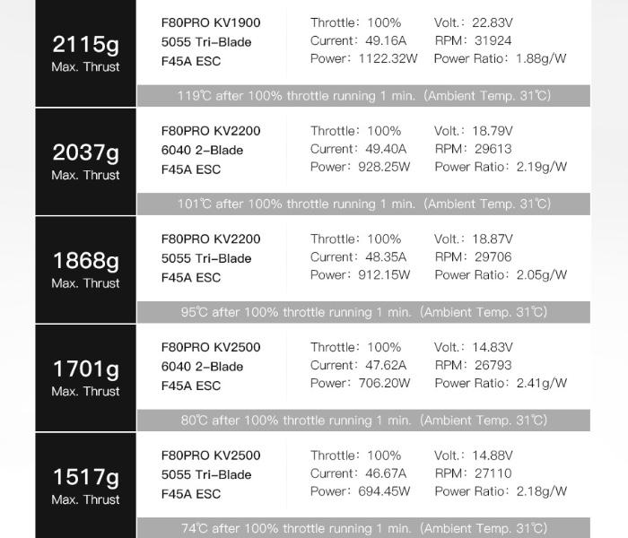 T-motor F80 Pro FPV Racing Motor Motor Diameter: 29mm x 33.6mmWeight: 36.4gCable: 150mm 20AWGShaft Diameter: 5mmConfiguration: 12N14PRate Voltage (LiPo): 3-6S