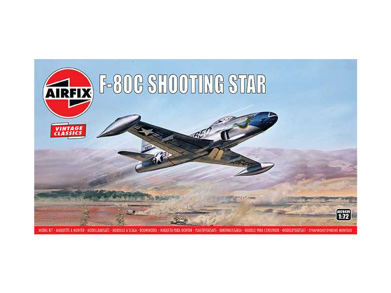 Plastikový model Airfix A02043V – letadlo Lockheed F-80C Shooting Star v měřítku 1:72 ke slepení. Stavebnice obsahuje 52 dílků, rozpětí křídel 164 mm, obtížnost 1.