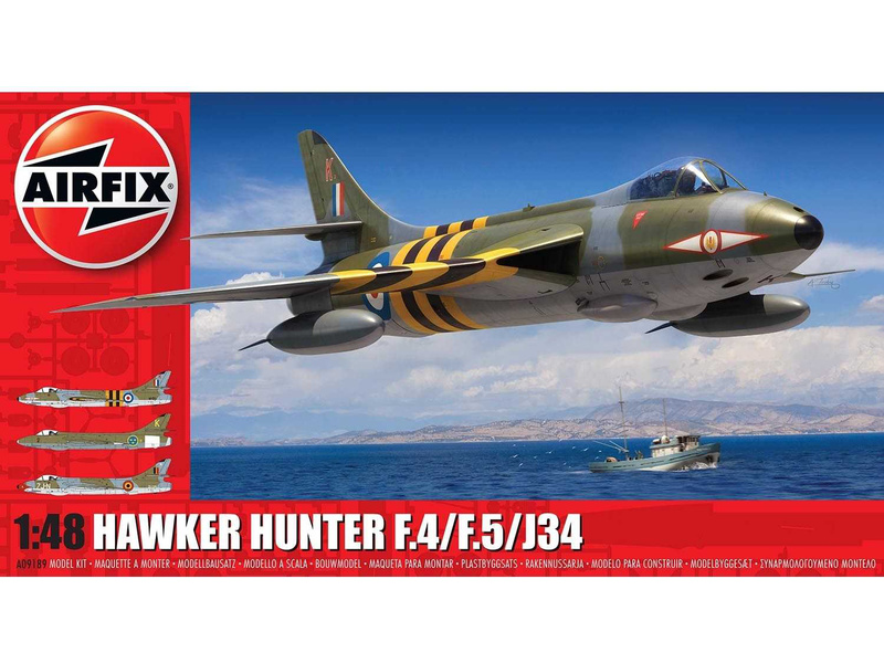 Plastikový model Airfix A09189 - letadlo Hawker Hunter F.4/F.5/J.34 v měřítku 1:48 ke slepení. Stavebnice obsahuje 124 dílků, rozpětí křídel 214 mm, obtížnost 3.